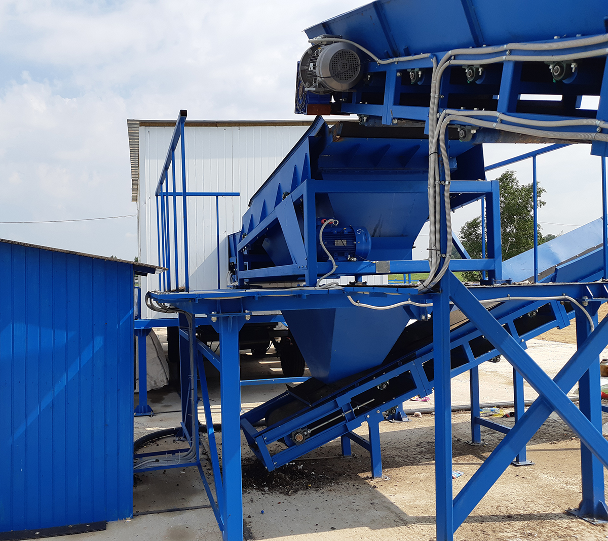 ТКО равномерно распределяются (загружаются) на подающий ленточный конвейер, путем регулирования высоты просвета заслонной пластиной, который транспортирует его в сепаратор (грохот) плоского типа (далее – Сепаратор).